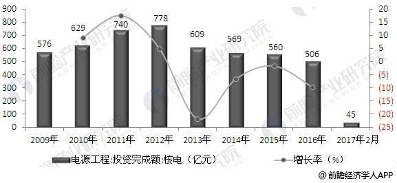 近年來,我國核電的電源工程投資完成額呈波動(dòng)變化態(tài)勢。據(jù)前瞻產(chǎn)業(yè)研究院發(fā)布的《核電行業(yè)市場前瞻與投資戰(zhàn)略規(guī)劃分析報(bào)告》數(shù)據(jù)顯示,2016年,我國核電的電源工程投資完成額為506億元,較上年同比下滑9.64%;據(jù)最新統(tǒng)計(jì),2017年1-2月,核電電源工程投資為45億元。