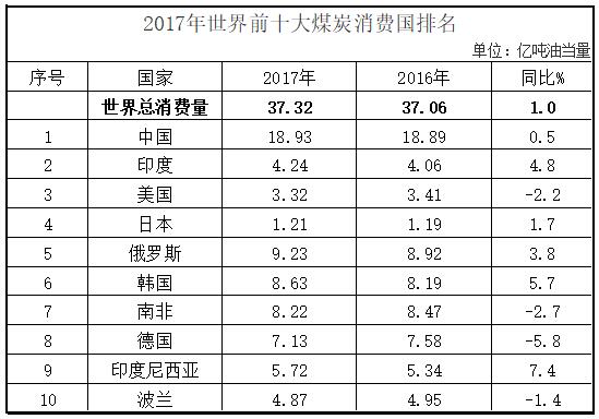 2017年,全球煤炭消費量為37.3億噸油當量,比上年上漲1.0%。其中,中國占世界煤炭總消費量的46.4%,比上年下降4.2個百分點;韓國超越南非成為全球第六大煤炭消費國。消費量排名前十的國家是中國、印度、美國、日本、俄羅斯、韓國、南非、印度尼西亞、德國和波蘭。