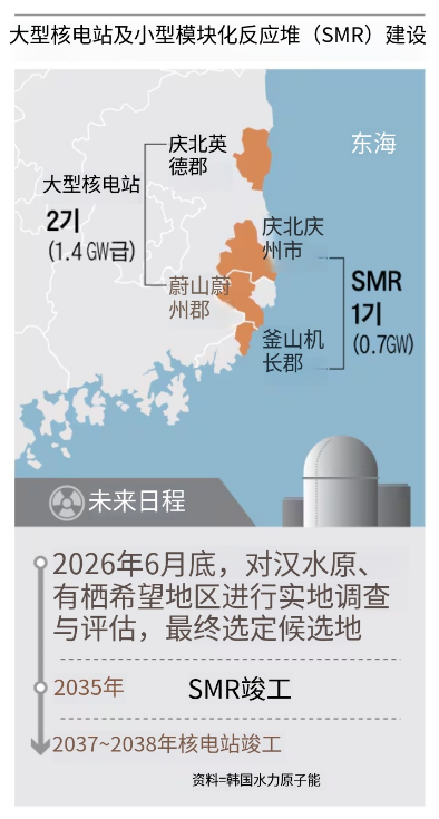 KHNP計劃6月前完成基礎調查、現場考察和外部專家委員會評估,隨后進行最終選址。選址評估采用100分制,選址適宜性、環境影響、施工可行性和公眾接受度各占25分。小型模塊化反應堆(SMR)目標2035年投入商業運營,兩座大型反應堆目標投入時間為2037 - 2038年。