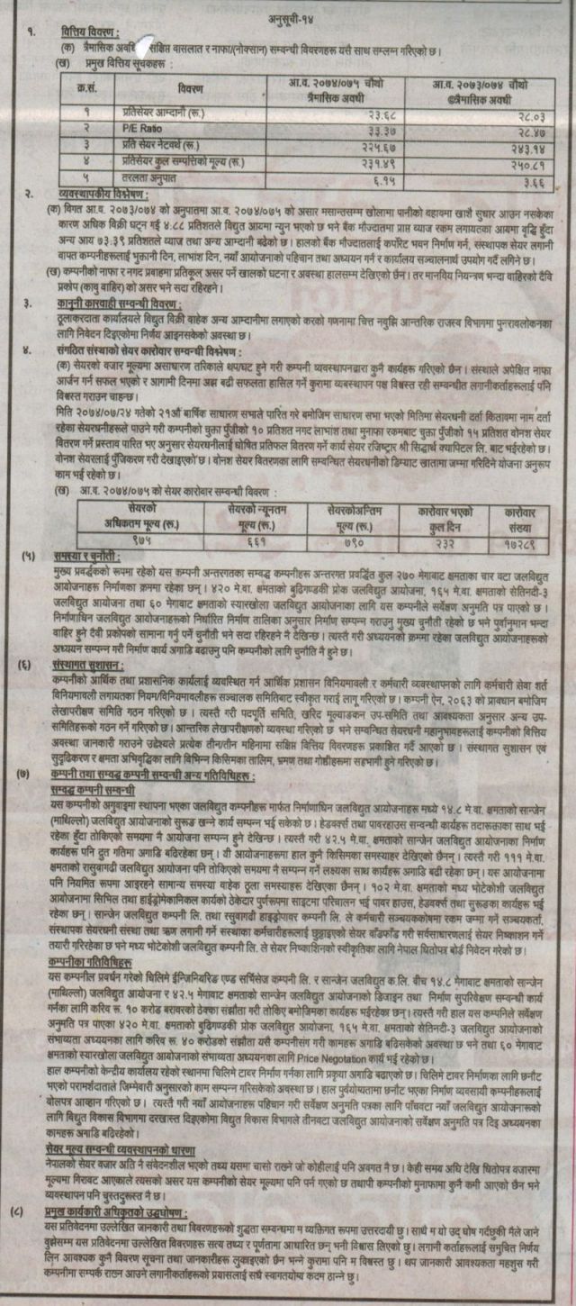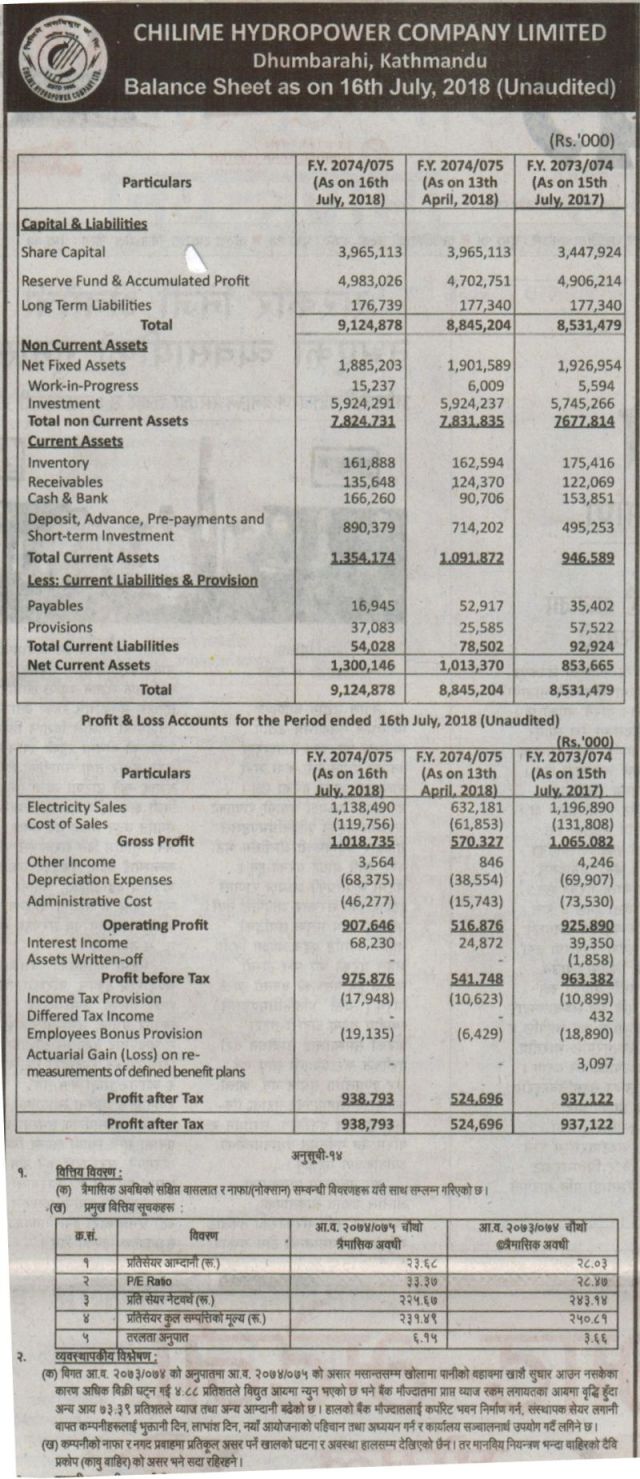 加德滿都(As)。Chillime水電公司已獲得盧比。93億賺取利潤。該利潤與之前的費用進行比較。16萬71萬多。本公司已在上一期間收費。盈利93.7億美元。由于公司收入的增加,利潤增加了。利息收入增加73%至盧比。已達到6.6億。公司的盧比。已經制造了10億1300萬。與早先的平均水平相比,這一收入低于4 87%。由于6月中旬水流量沒有改善,電力銷售下降。公司的收入收入 23位小數68,價格收入比率為33位小數37倍,凈利潤率為小數點后2.2位67。