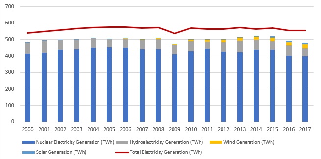 圖1.法國(guó)2000 - 2017年的發(fā)電量(按太瓦時(shí)計(jì)算)。