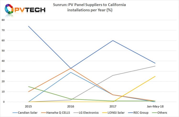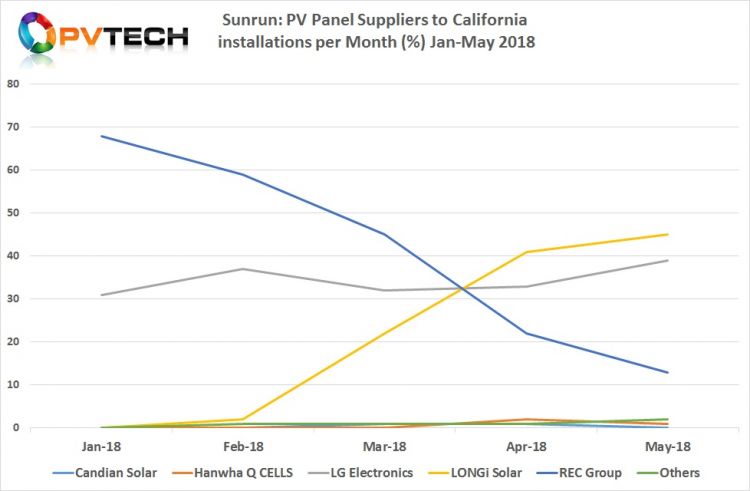 LONGi Solar于2018年初開始作為Sunrun的新供應(yīng)商,2018年前四個(gè)月的平均份額達(dá)到25%。
