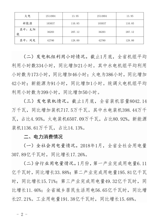 2018年1月,全省全社會(huì)用電量307.89億千瓦時(shí),同比增長17。26%。全省發(fā)電量268.7億千瓦時(shí),同比增長16.49%。以下為具體數(shù)據(jù):