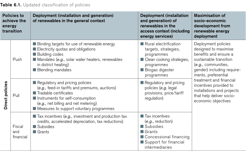 表6.1 提出了更新的可再生能源政策分類:直接政策文件,一體化政策,以及扶持政策。