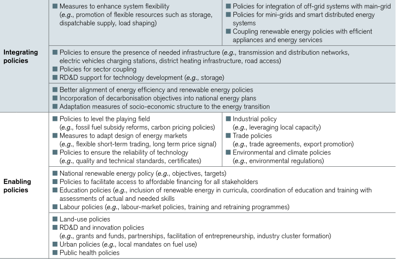 實現能源轉型,需要的不僅僅是針對能源部門制定的政策更為全面。能源領域的迅速變化需要一種新的政策分類方式,這涉及到能源系統的轉變和它賴以生存的社會經濟結構的轉變。這期間的政策需要采取綜合辦法,兼顧這兩個方面。隨著可再生能源從利基轉向主流,推動轉型的政策不僅必須涵蓋可再生能源的部署,還必須納入影響可持續性和轉型速度的更廣泛的能源系統和經濟政策。
